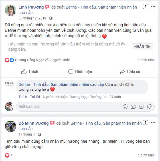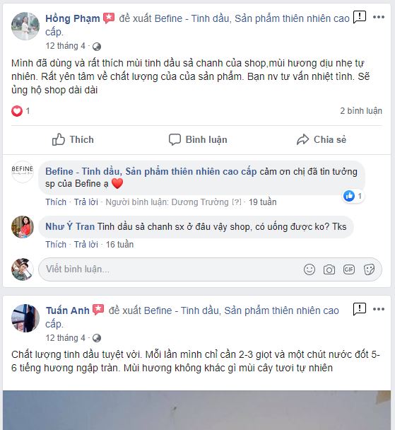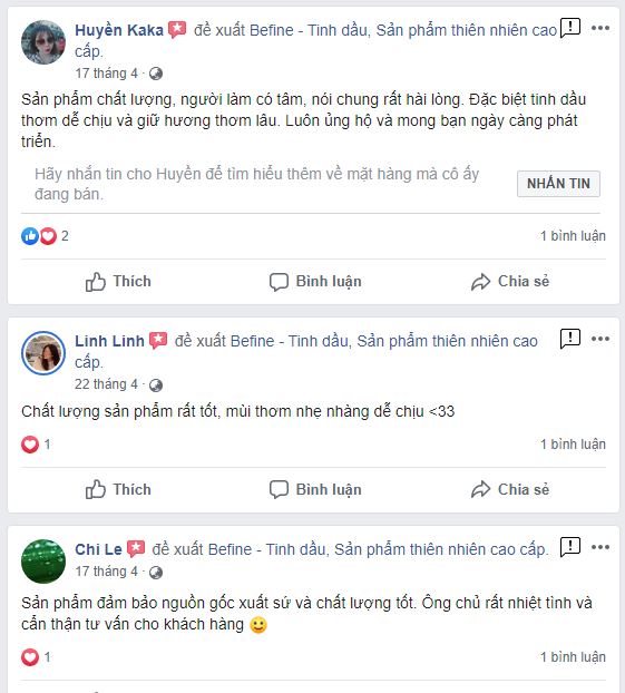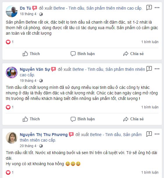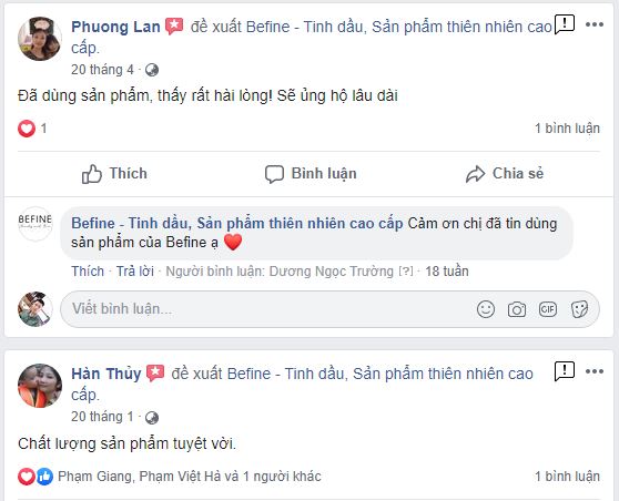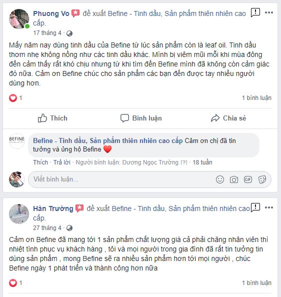 Đã có rất nhiều những phản hồi từ khách hàng về các sản phẩm của Befine, các bạn có thể xem ở các ảnh phía dưới hoặc vào fanpage facebook https://www.facebook.com/befine.vn để tìm hiểu chi tiết hơn nhé.